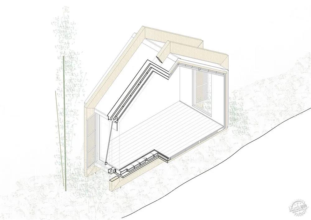 代表性與象征性形象。在建筑的外部,建筑師通過技術(shù)和形式來表達(dá)整體的代表性與象征性特征,建筑師希望項(xiàng)目簡(jiǎn)約、干凈、優(yōu)雅,并且通過緊湊的山墻體量構(gòu)成了建筑的原型。項(xiàng)目較為抽象,白色的體量強(qiáng)調(diào)了木制結(jié)構(gòu)的特征,展館的概念也很好地表達(dá)了其空間本質(zhì),即建筑。