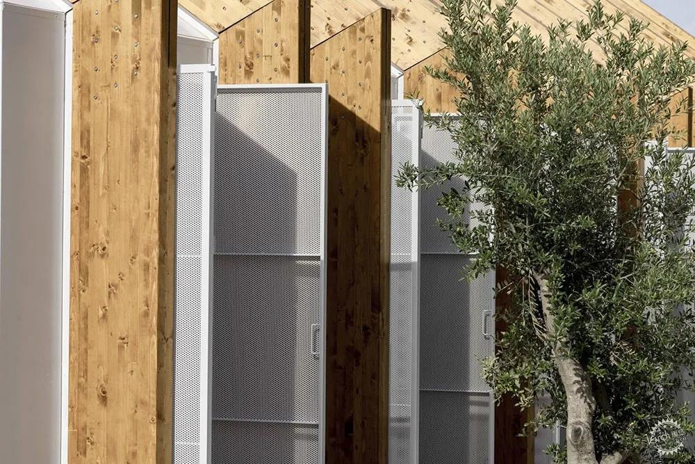 這是一個(gè)干燥的工業(yè)化木結(jié)構(gòu),能夠保證質(zhì)量,對(duì)于環(huán)境的影響低,但是有著一定的效率、經(jīng)濟(jì)效益,以及結(jié)構(gòu)設(shè)計(jì)精準(zhǔn)度。與此同時(shí),這種體系便于運(yùn)輸、調(diào)試、裝卸,為了滿足這些需求,結(jié)構(gòu)、天花板、立面、技術(shù)樓層的綜合網(wǎng)絡(luò)和空調(diào)之間的協(xié)調(diào)必不可少。在建筑內(nèi)部,項(xiàng)目的最后一層覆蓋了與展館中建筑部分相同的完成面。