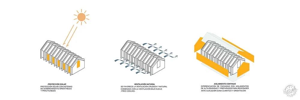 全球化設(shè)計(jì)以減少需求為基礎(chǔ),注重節(jié)能標(biāo)準(zhǔn),建筑師應(yīng)用了許多被動(dòng)式策略,其中包括緊湊連續(xù)的隔熱系統(tǒng)、適應(yīng)性太陽(yáng)能保護(hù)體系、動(dòng)態(tài)負(fù)荷控制或自然通風(fēng)體系。在高峰需求時(shí),項(xiàng)目的目標(biāo)是在5/7天的10/24小時(shí)中實(shí)行連貫的積極策略,將消耗降至最低。除此之外,建筑師還在整個(gè)項(xiàng)目中結(jié)合應(yīng)用空氣熱能和雙流熱焓回?zé)崞鳎@可以通風(fēng)與控制溫度,另外再利用空氣熱能和地暖來減少耗能。