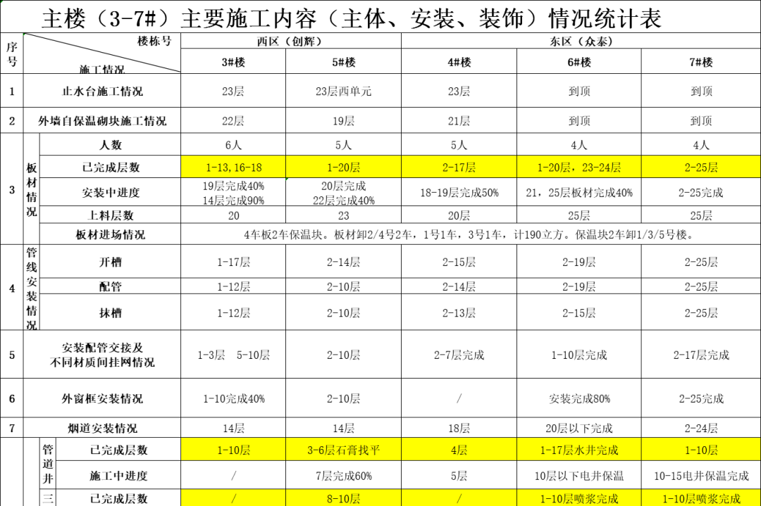 各樓棟專業(yè)工程師每日盤點通報現(xiàn)場進度情況,每日早中晚對比,緊盯關鍵工序;緊盯各工序的最早開始時間,督促各工作按節(jié)點完成,為后續(xù)施工創(chuàng)造有利條件。